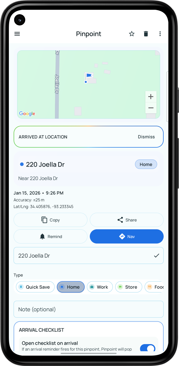 Pinpoint is designed for people who rely on locations in real life — not just addresses, but places with meaning. Whether it’s a parking spot, job site, delivery location, trailhead, storage unit, or client visit, Pinpoint lets you save locations with rich context so nothing important is lost.