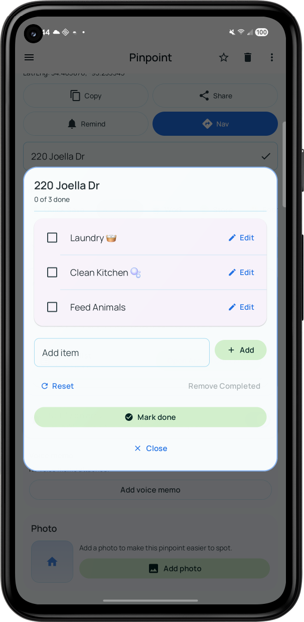 Instead of dropping anonymous pins, Pinpoint allows you to attach notes, photos, and voice memos to each place. You can add arrival reminders, build simple checklists for repeat trips, and organize everything so it stays fast and friction‑free — even when you’re in a hurry.